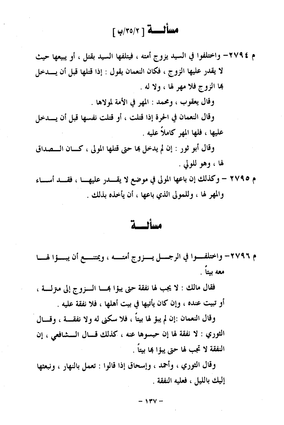 م 2794 - واختلفوا في السيد يزوج أمته، فيتلفها السيد بقتل، أو يبيعها حيث لا يقدر عليها الزوج، فكان النعمان يقول: إذا قتلها قبل أن يدخل بها الزوج فلا مهر لها، ولا له.