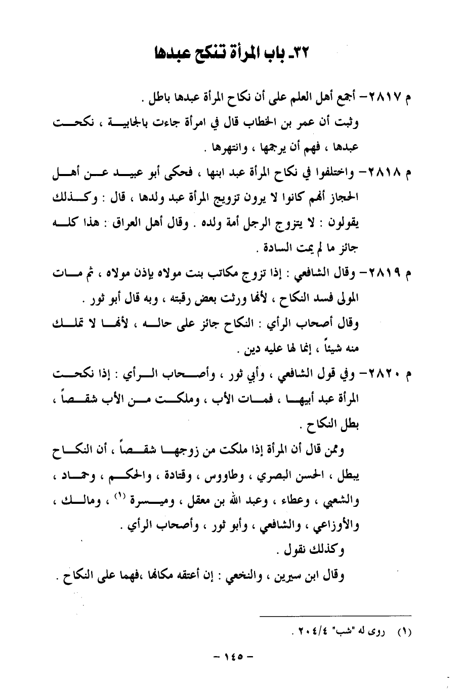 م 2818 - واختلفوا في نكاح المرأة عبد ابنها، فحكى أبو عبيد عن أهل الحجاز أنهم كانوا لا يرون تزويج المرأة عبد ولدها، قال: وكذلك يقولون: لا يتزوج الرجل أمة ولده. وقال أهل العراق: هذا كله جائز ما لم يمت السادة.