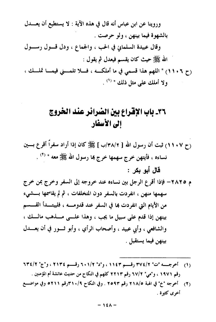 (ح 1107) ثبت أن رسول الله [2/ 38/ب]- صلى الله عليه وسلم - كان إذا أراد سفراً أقرع بين نساءه، فأيتهن خرج سهمها خرج بها رسول الله- صلى الله عليه وسلم - معه".