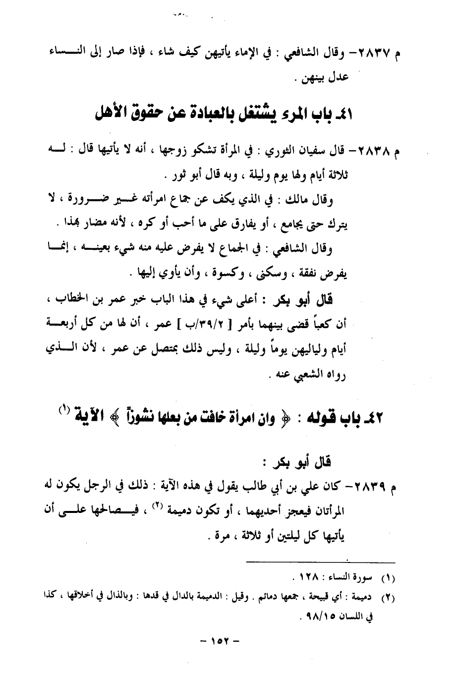 م 2838 - قال سفيان الثوري: في المرأة تشكو زوجها، أنه لا يأتيها قال: له ثلاثة أيام ولها يوم وليلة، وبه قال أبو ثور.