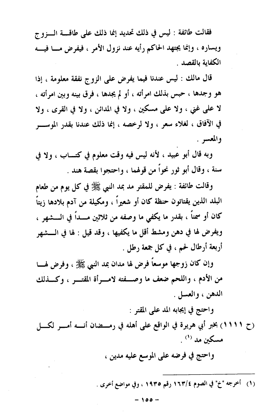 وقالت طائفة: يفرض للمقتر مد بمد النبي- صلى الله عليه وسلم - في كل يوم من طعام البلد الذين يقتاتون حنطة كان أو شعيراً، ومكيلة من آدم بلادها زيتاً كان أو سمناً، بقدر ما يكفي ما وصفه من ثلاثين مداً في الشهر، ويفرض لها في دهن ومشط أقل ما يكفيها، وقد قيل: لها في الشهر أربعة أرطال لحم، في كل جمعة رطل.