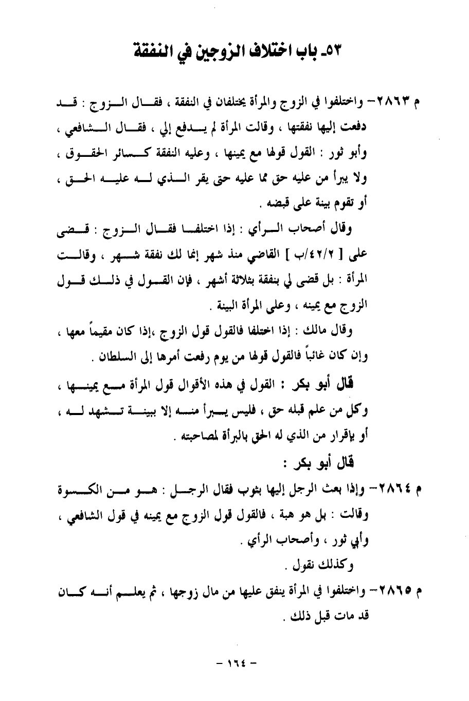 م 2863 - واختلفوا في الزوج والمرأة يختلفان في النفقة، فقال الزوج: قد دفعت إليها نفقتها، وقالت المرأة لم يدفع إلي، فقال الشافعي، وأبو ثور: القول قولها مع يمينها، وعليه النفقة كسائر الحقوق، ولا يبرأ من عليه حق مما عليه حتى يقر الذي له عليه الحق، أو تقوم بينة على قبضه.