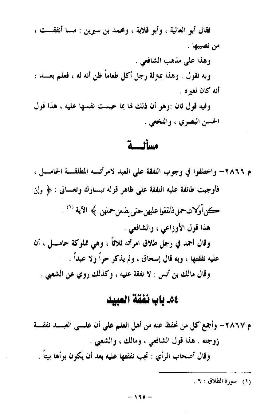 م 2866 - واختلفوا في وجوب النفقة على العبد لامرأته المطلقة الحامل، فأوجبت طائفة عليه النفقة على ظاهر قوله تبارك وتعالى: {وَإِنْ كُنَّ أُولَاتِ حَمْلٍ فَأَنْفِقُوا عَلَيْهِنَّ حَتَّى يَضَعْنَ حَمْلَهُنَّ} الآية.