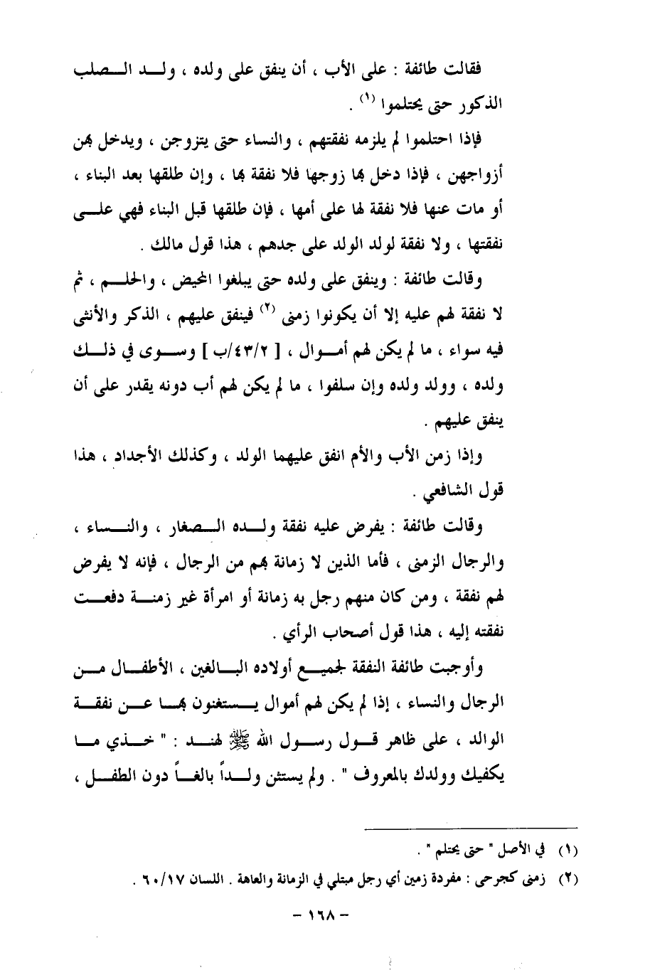 وقالت طائفة: وينفق على ولده حتى يبلغوا المحيض، والحلم، ثم لا نفقة لهم عليه إلا أن يكونوا زمنى فينفق عليهم، الذكر والأنثى فيه سواء، ما لم يكن لهم أموال، [2/ 43/ب] وسوى في ذلك ولده، وولد ولده وإن سلفوا، ما لم يكن لهم أب دونه يقدر على أن ينفق عليهم.