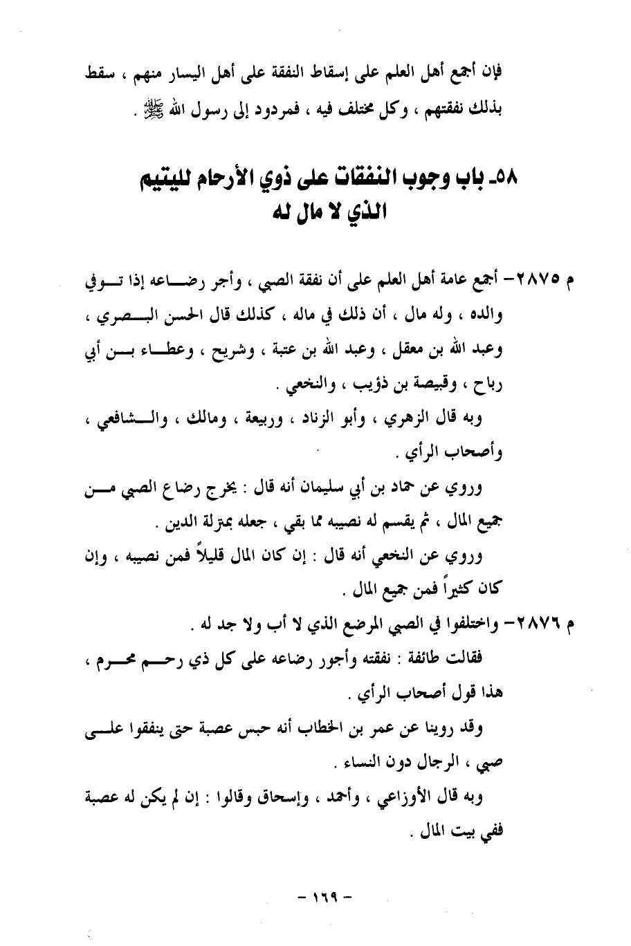 م 2875 - أجمع عامة أهل العلم على أن نفقة الصبي، وأجر رضاعه إذا توفي والده، وله مال، أن ذلك في ماله، كذلك قال الحسن البصري، وعبد الله بن معقل، وعبد الله بن عتبة، وشريح، وعطاء بن أبي رباح، وقبيصة بن ذؤيب، والنخعي.
