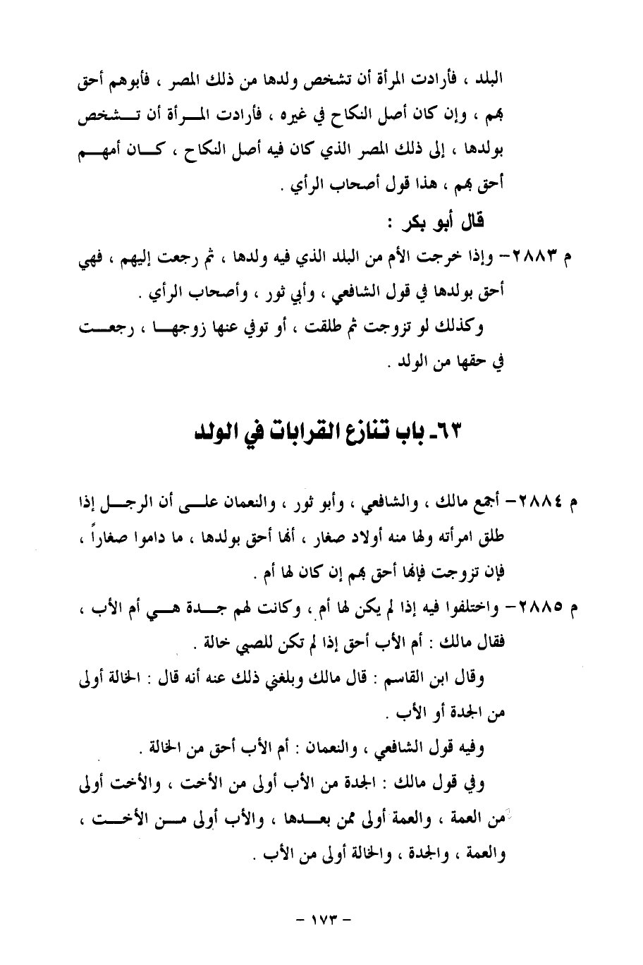 م 2884 - أجمع مالك، والشافعي، وأبو ثور، والنعمان على أن الرجل إذا طلق امرأته ولها منه أولاد صغار، أنها أحق بولدها، ما داموا صغاراً، فإن تزوجت فإنها أحق بهم إن كان لها أم.