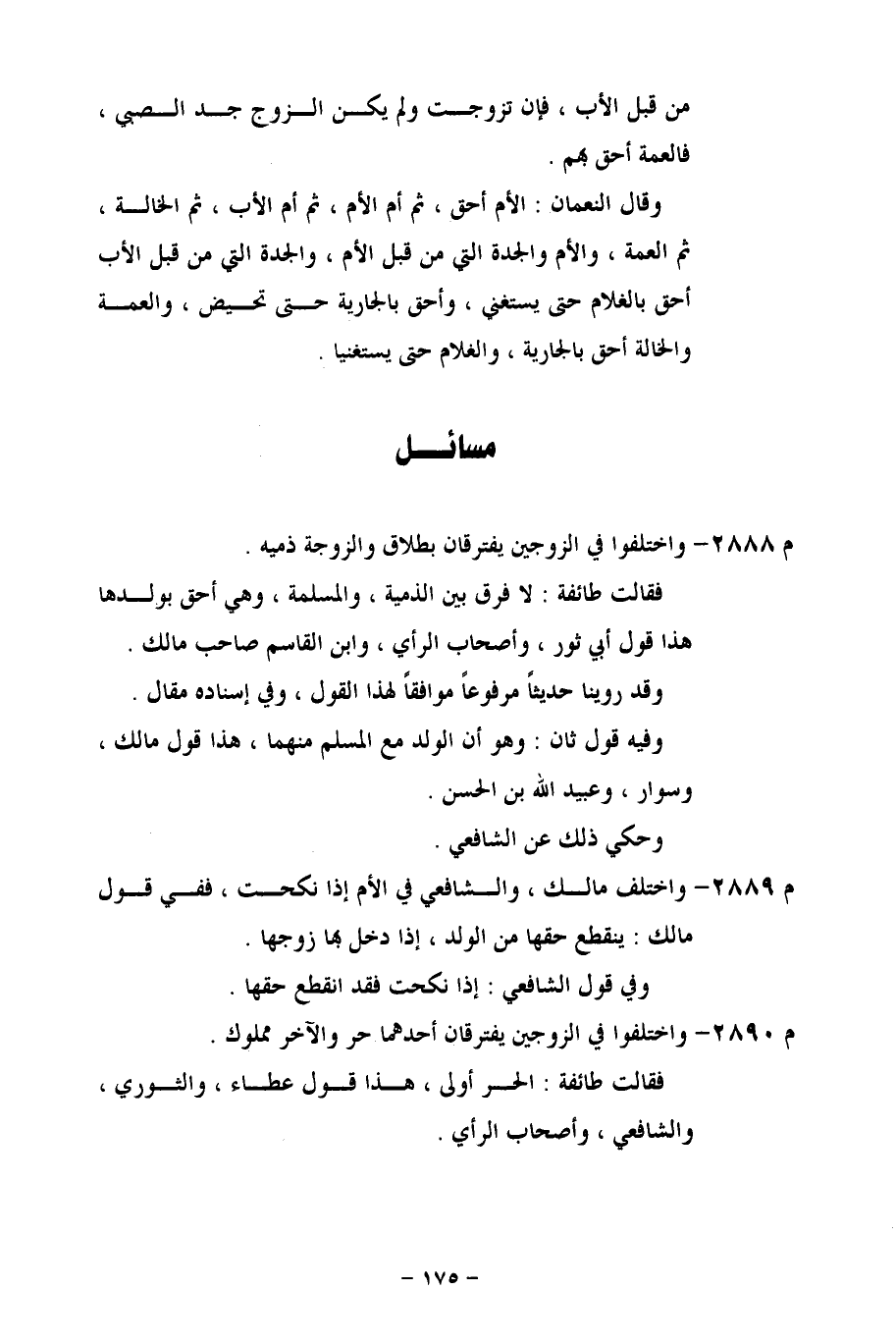 م 2889 - واختلف مالك، والشافعي في الأم إذا نكحت، ففي قول مالك: ينقطع حقها من الولد، إذا دخل بها زوجها.
