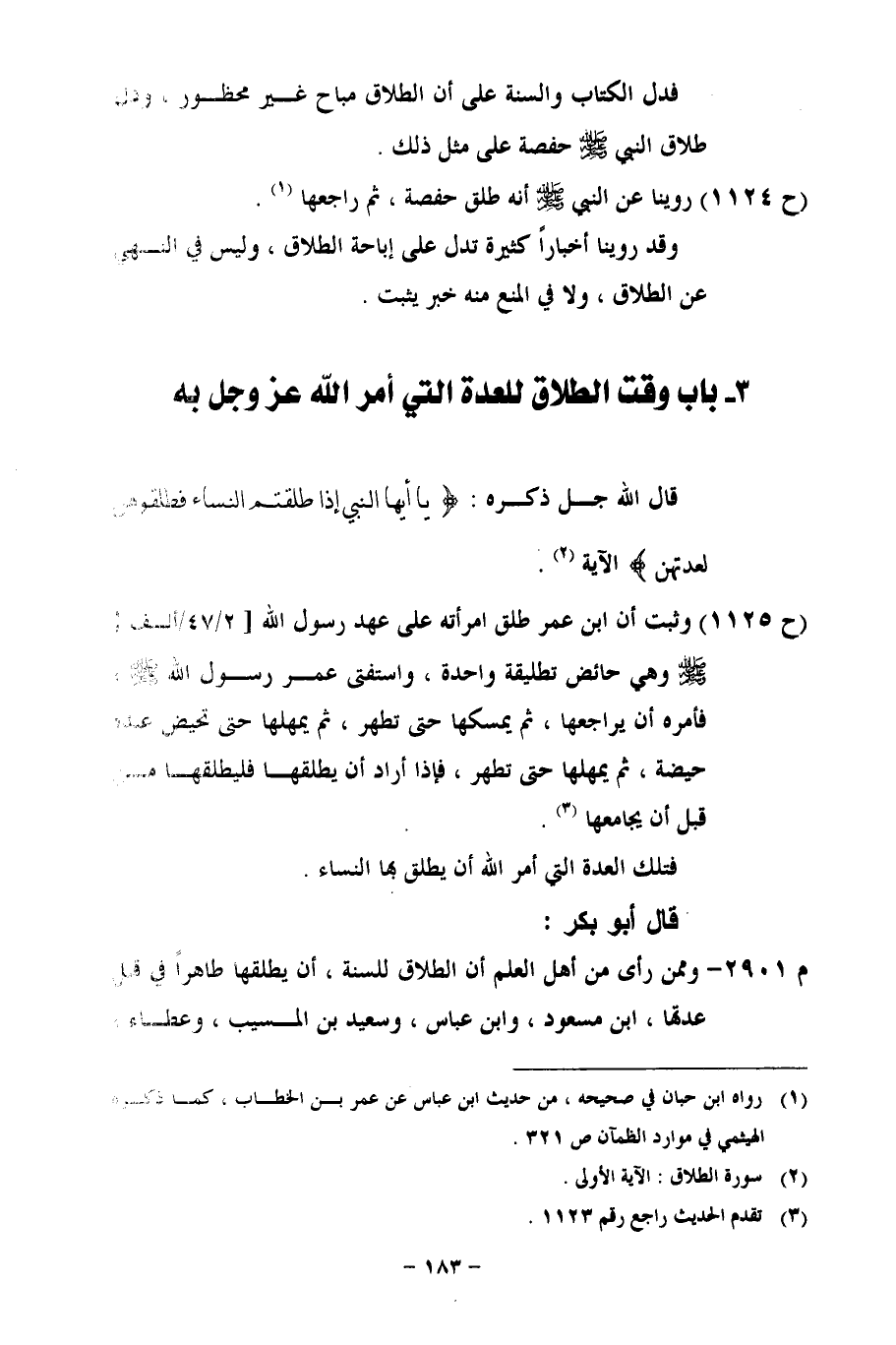 (ح 1125) وثبت أن ابن عمر طلق امرأته على عهد رسول الله- صلى الله عليه وسلم -[2/ 47/ألف]- صلى الله عليه وسلم - وهي حائض تطليقة واحدة، واستفتى عمر رسول الله - صلى الله عليه وسلم -.