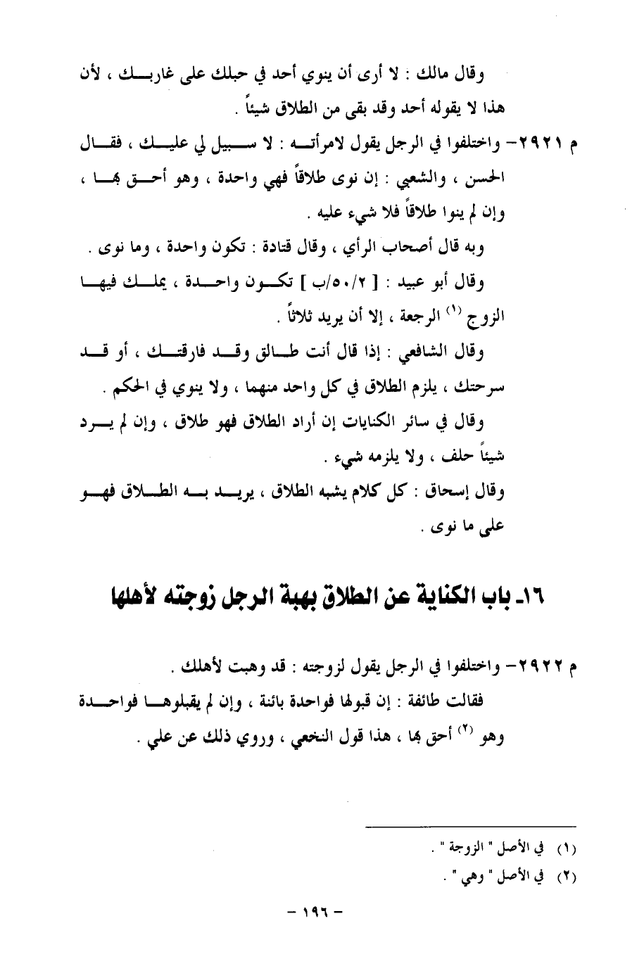 م 2921 - واختلفوا في الرجل يقول لامرأته: لا سبيل لي عليك، فقال الحسن، والشعبى: إن نوى طلاقاً فهي واحدة، وهو أحق بها، وإن لم ينوا طلاقاً فلا شيء عليه.