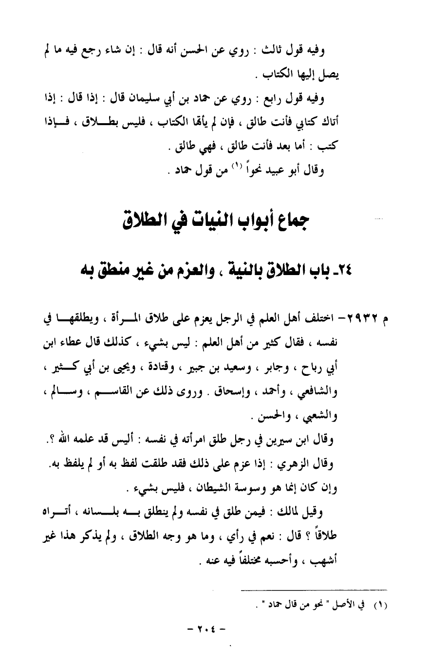 م 2932 - اختلف أهل العلم في الرجل يعزم على طلاق المرأة، ويطلقها في نفسه، فقال كثر من أهل العلم: ليس بشيء، كذلك قال عطاء ابن أبي رباح، وجابر، وسعيد بن جبير، وقتادة، ويحيى بن أبي كثير، والشافعي، وأحمد، وإسحاق. وروى ذلك عن القاسم، وسالم، والشعبي، والحسن.
