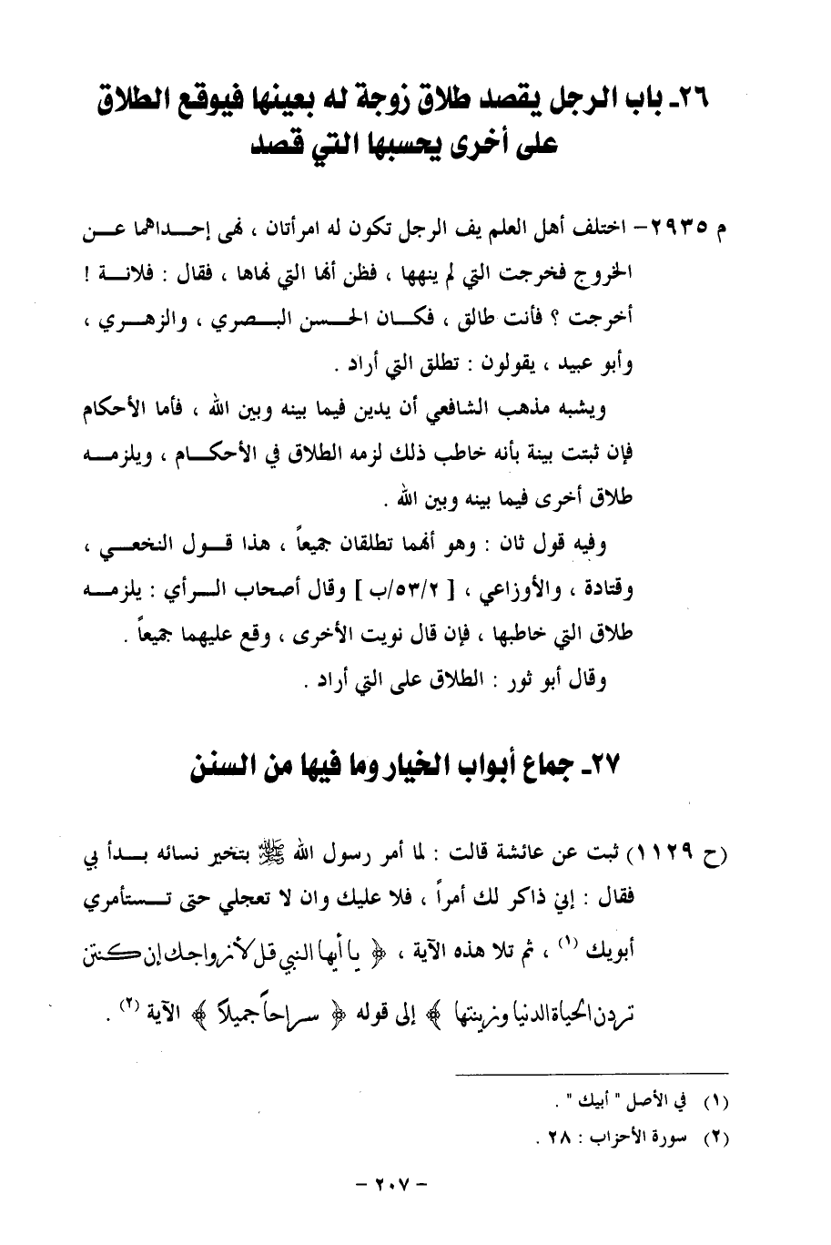 (ح 1129) ثبت عن عائشة قالت: لما أمر رسول الله- صلى الله عليه وسلم - بتخير نسائه بدأ بي فقال: إني ذاكر لك أمراً، فلا عليك وان لا تعجلي حتى تستأمري أبويك (¬1)، ثم تلا هذه الآية، {يَا أَيُّهَا النَّبِيُّ قُلْ لِأَزْوَاجِكَ إِنْ كُنْتُنَّ تُرِدْنَ الْحَيَاةَ الدُّنْيَا وَزِينَتَهَا} إلى قوله {سَرَاحًا جَمِيلًا} الآية.