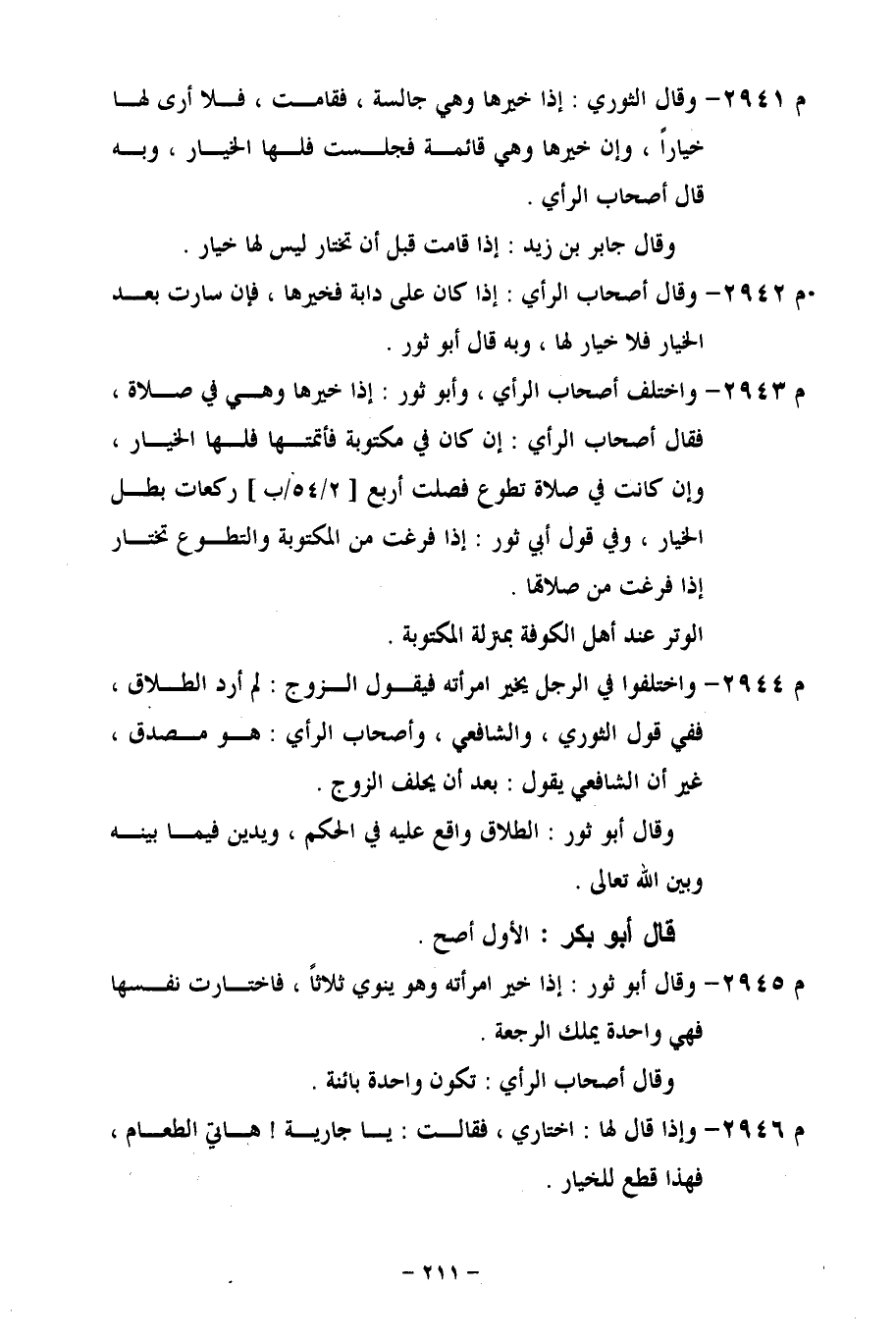 م 2943 - واختلف أصحاب الرأي، وأبو ثور: إذا خيرها وهي في صلاة، فقال أصحاب الرأي: إن كان في مكتوبة فأتمتها فلها الخيار، وإن كانت في صلاة تطوع فصلت أربع [2/ 54/ب] ركعات بطل الخيار، وفي قول أبي ثور: إذا فرغت من المكتوبة والتطوع تختار إذا فرغت من صلاتها.