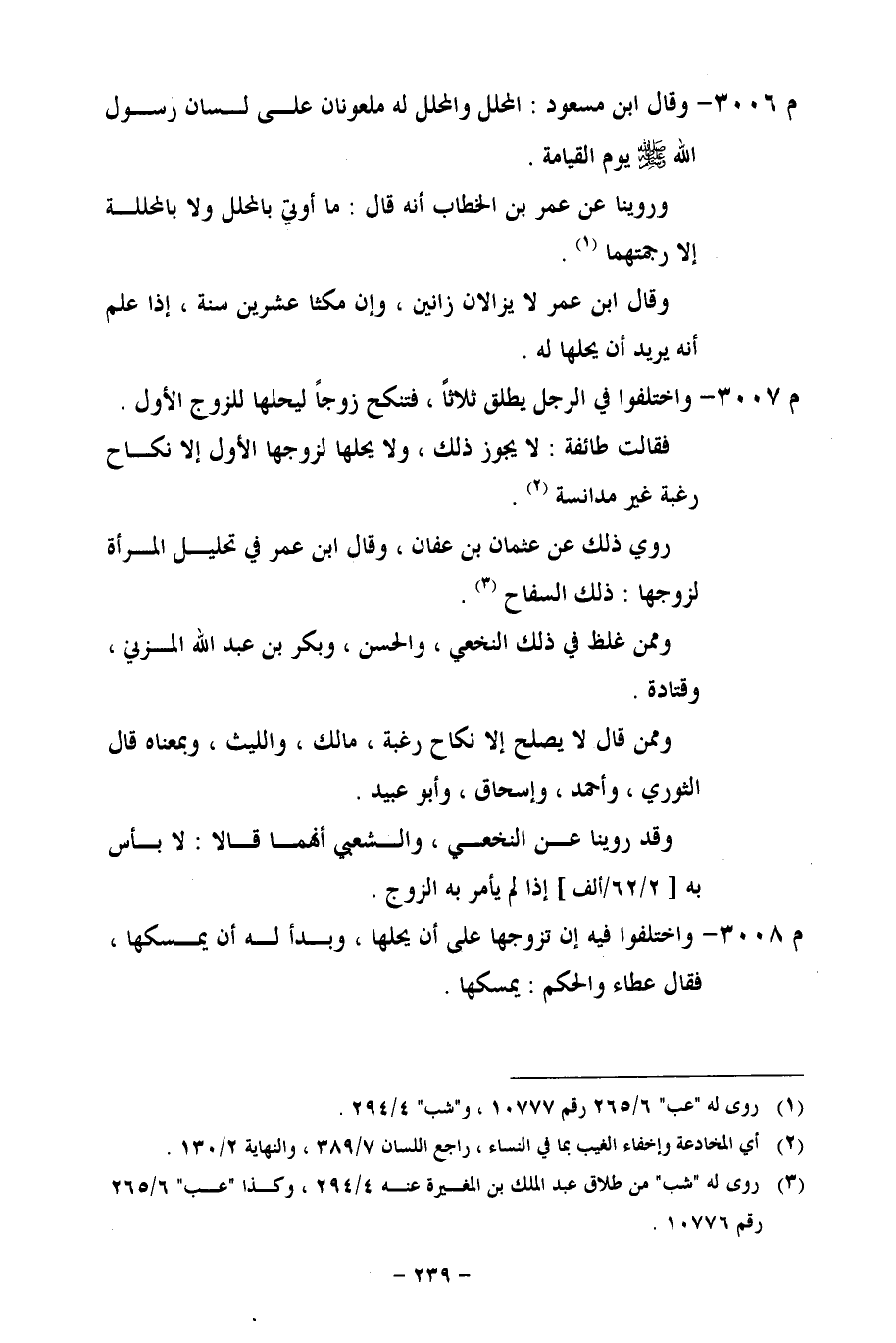 م 3006 - وقال ابن مسعود: المحلل والمحلل له ملعونان على لسان رسول الله - صلى الله عليه وسلم - يوم القيامة.