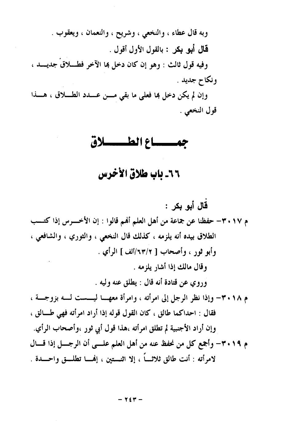 م 3517 - حفظنا عن جماعة من أهل العلم أنهم قالوا: إن الأخرس إذا كتب الطلاق بيده أنه يلزمه، كذلك قال النخعي، والثوري، والشافعي، وأبو ثور، وأصحاب [2/ 63/ألف] الرأي.