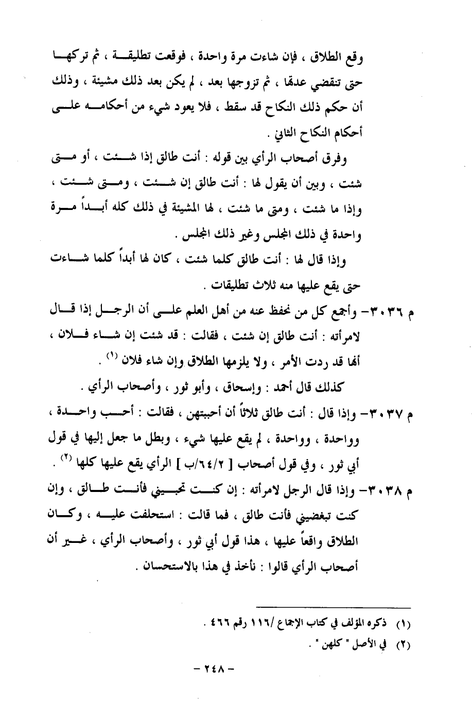 م 3037 - وإذا قال: أنت طالق ثلاثاً أن أحببتهن، فقالت: أحب واحدة، وواحدة، وواحدة، لم يقع عليها شيء، وبطل ما جعل إليها في قول أبي ثور، وفي قول أصحاب [2/ 64/ب] الرأي يقع عليها كلها (¬2).