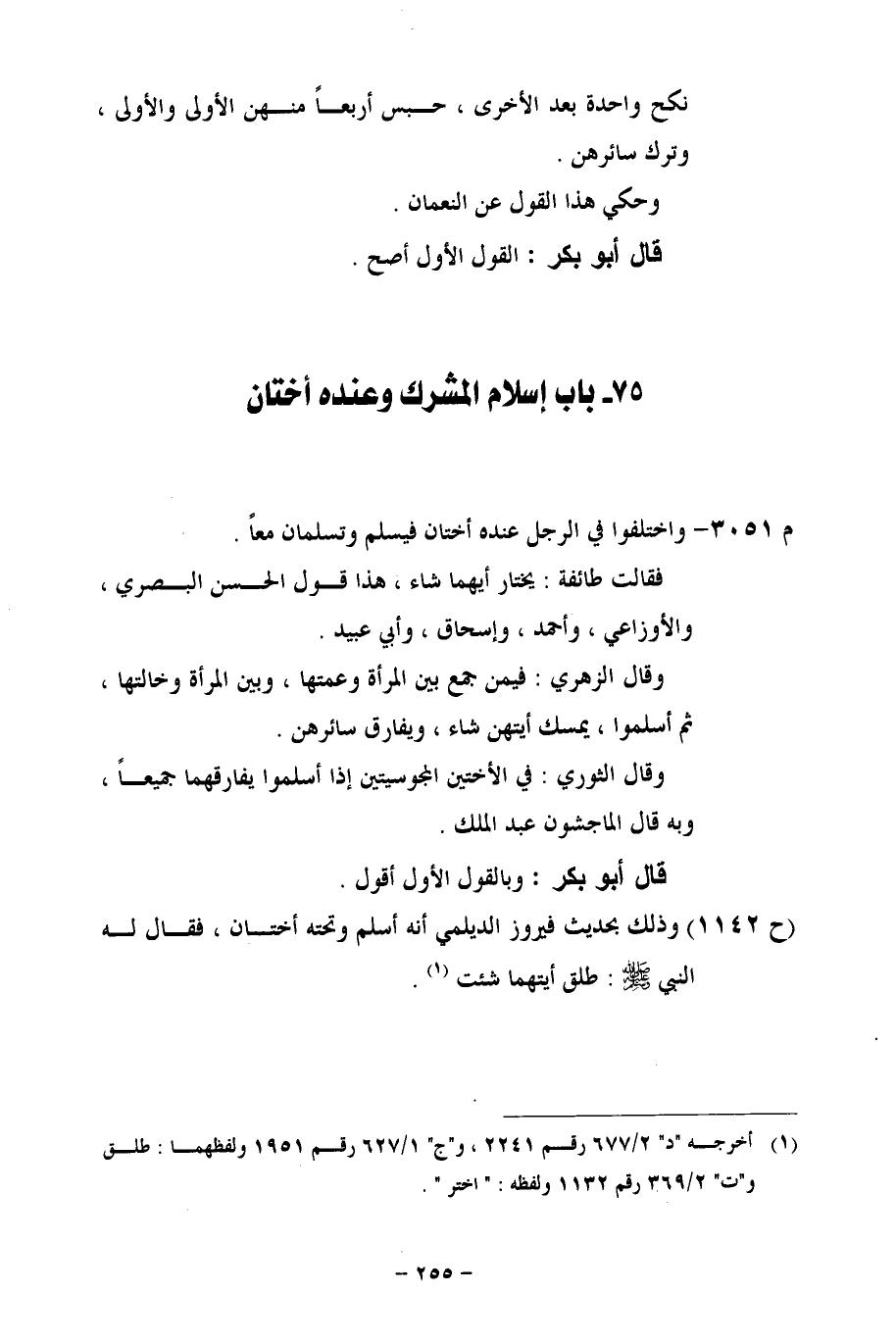 (ح 1142) وذلك بحديث فيروز الديلمي أنه أسلم وتحته أختان، فقال له النبي- صلى الله عليه وسلم -: طلق أيتهما شئت.
