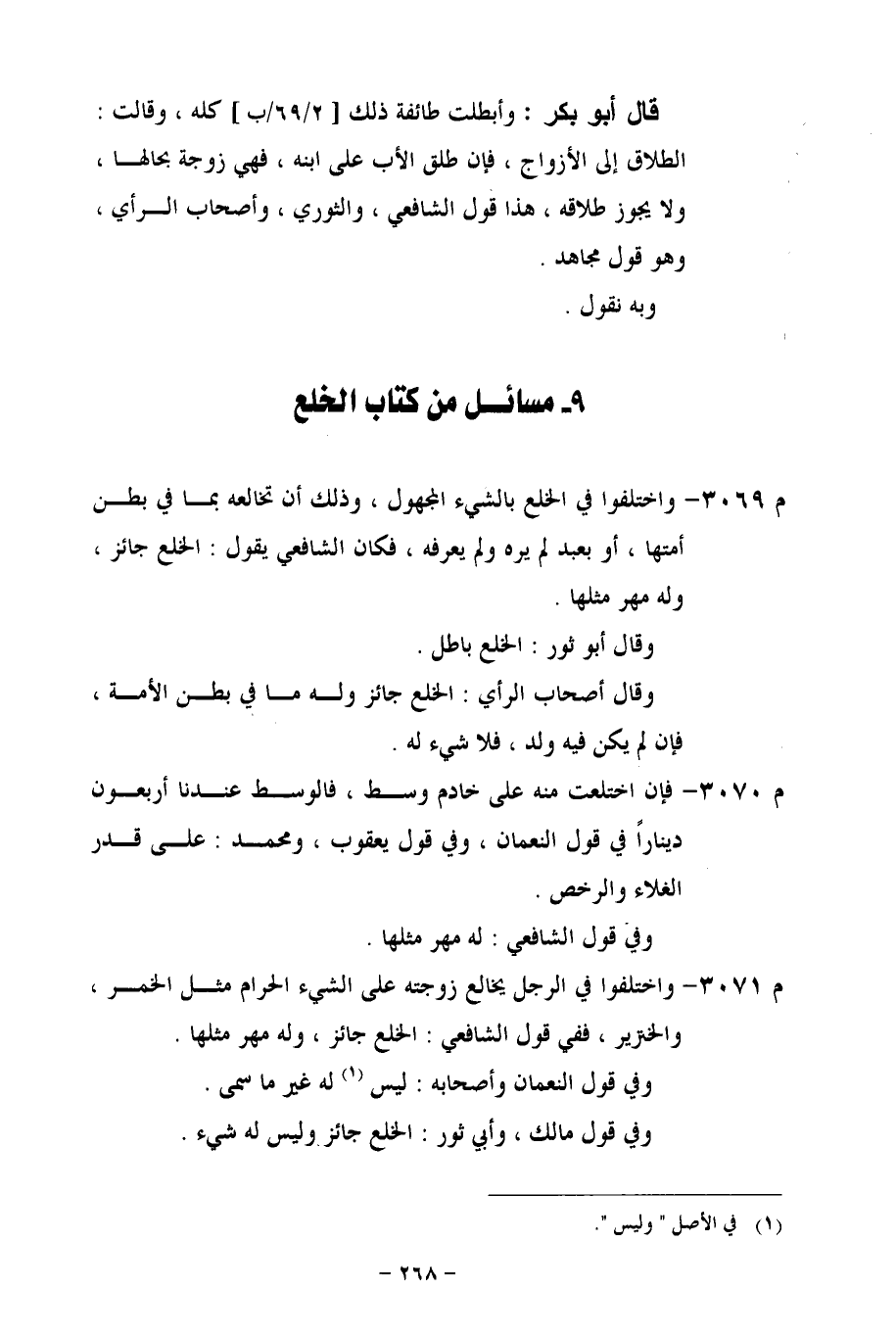 م 3070 - فإن اختلعت منه على خادم وسط، فالوسط عندنا أربعون ديناراً في قول النعمان، وفي قول يعقوب، ومحمد: على قدر الغلاء والرخص.