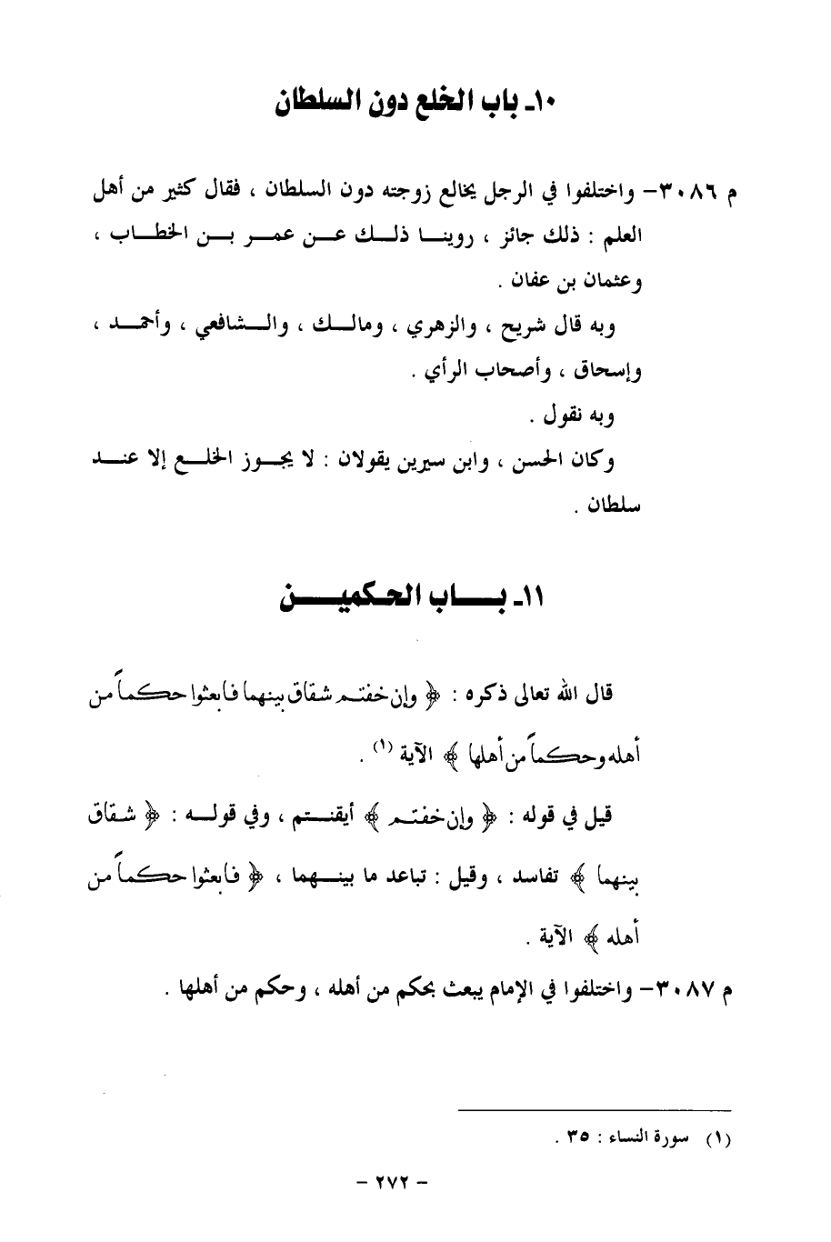 م 3086 - واختلفوا في الرجل يخالع زوجته دون السلطان، فقال كثير من أهل العلم: ذلك جائز، روينا ذلك عن عمر بن الخطاب، وعثمان بن عفان.