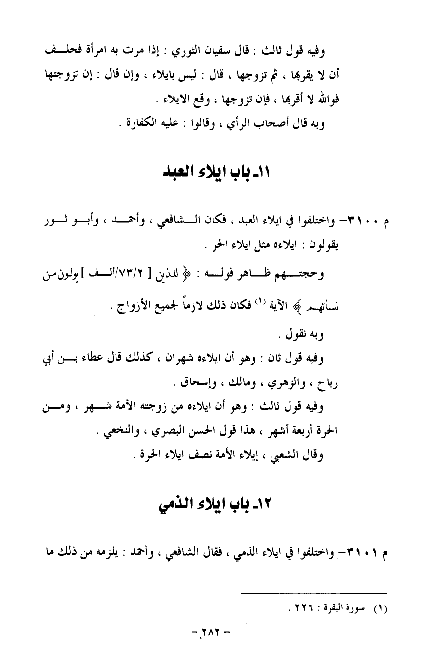 م 3100 - واختلفوا في ايلاء العبد، فكان الشافعي، وأحمد، وأبو ثور يقولون: ايلاءه مثل ايلاء الحر.