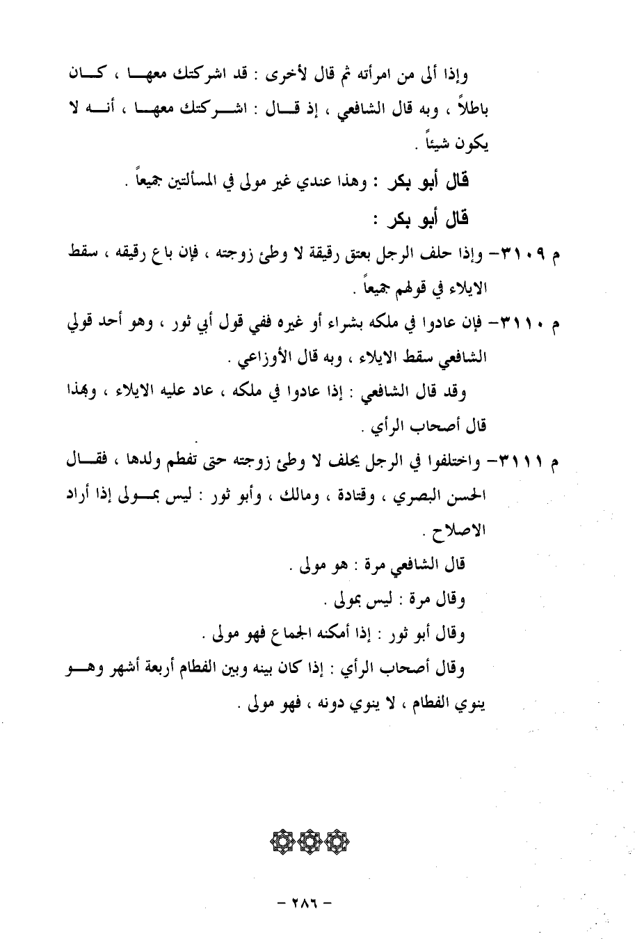 م 3109 - وإذا حلف الرجل بعتق رقيقة لا وطئ زوجته، فإن باع رقيقه، سقط الايلاء في قولهم جميعاً.