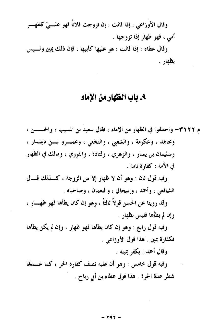م 3122 - واختلفوا في الظهار من الأماء، فقال سعيد بن المسيب، والحسن، ومجاهد، وعكرمة، والشعبي، والنخعي، وعمرو بن دينار، وسليمان بن يسار، والزهري، وقتادة، والثوري، ومالك في الظهار في الأمة: كفارة تامة.