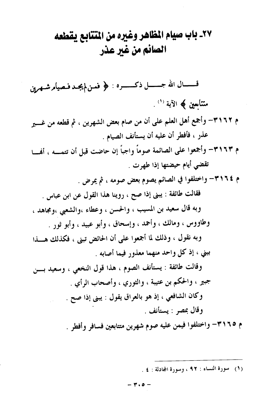 م 3162 - وأجمع أهل العلم على أن من صام بعض الشهرين، ثم قطعه من غير عذر، فأفطر أن عليه أن يستأنف الصيام.