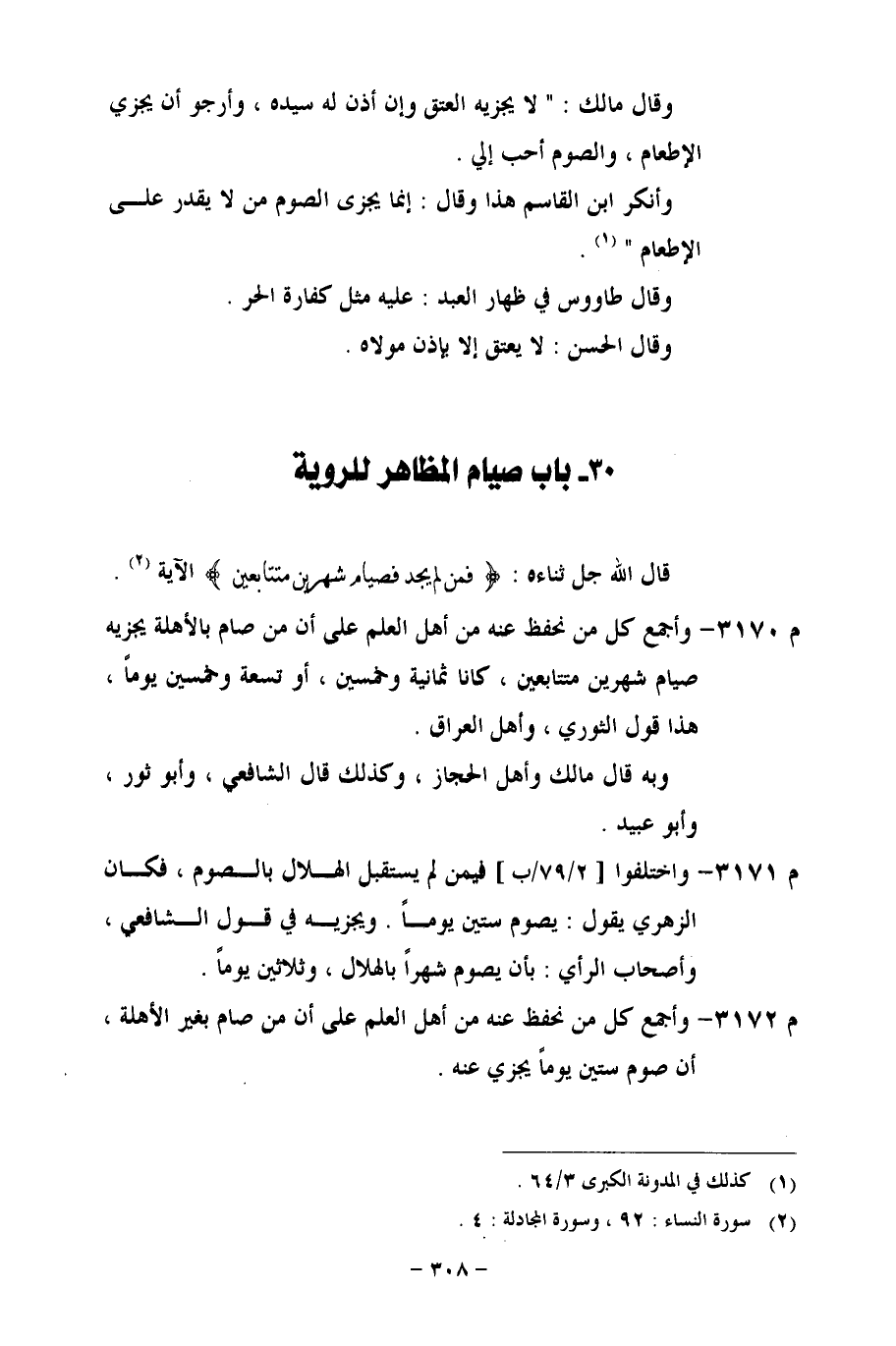 م 3170 - وأجمع كل من نحفظ عنه من أهل العلم على أن من صام بالأهلة يجزيه صيام شهرين متتابعين، كانا ثمانية وخمسين، أو تسعة وخمسين يوماً، هذا قول الثوري، وأهل العراق.
