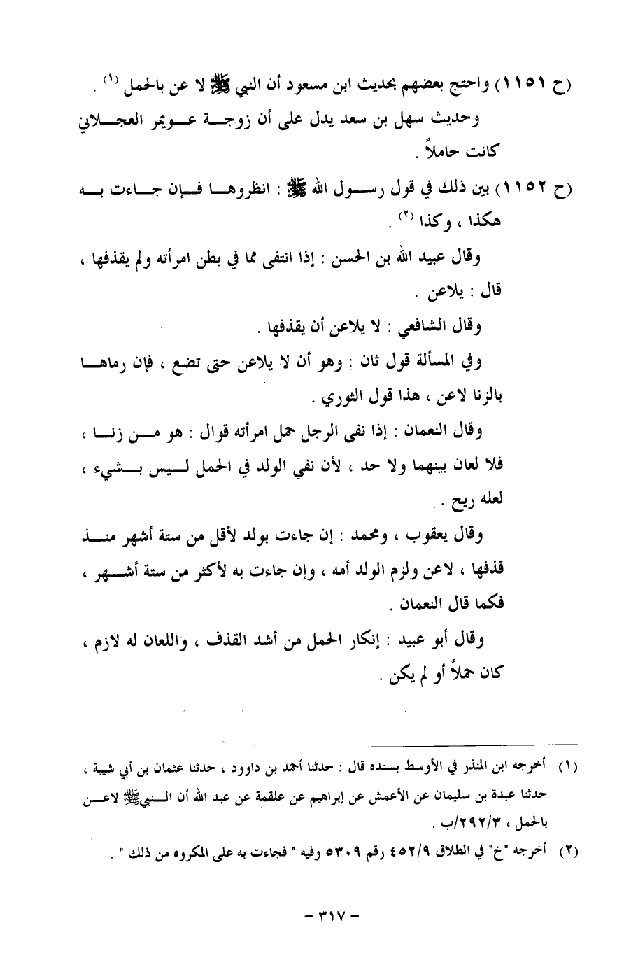 (ح 1151) واحتج بعضهم بحديث ابن مسعود أن النبي- صلى الله عليه وسلم - لاعن بالحمل.