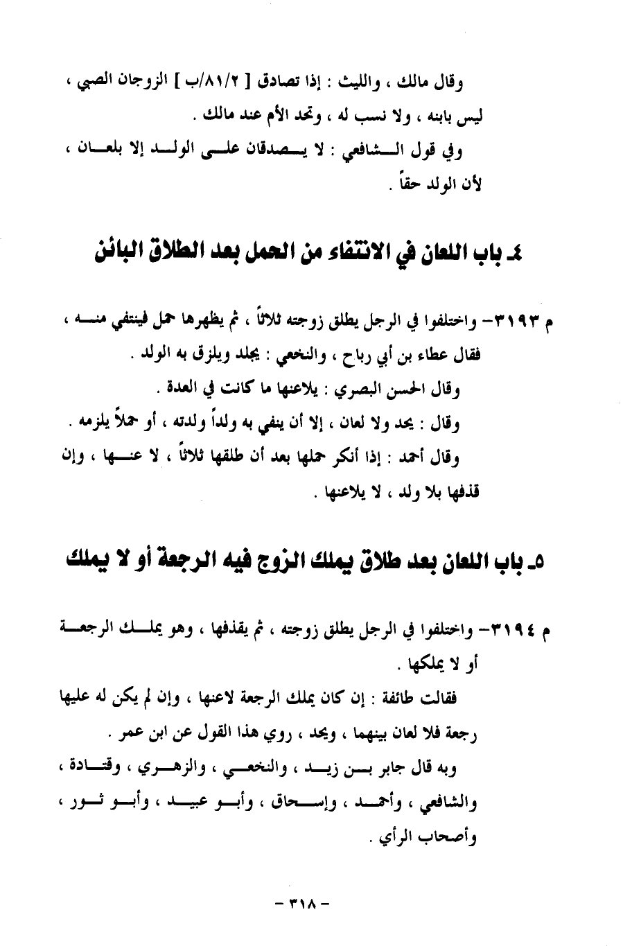 م 3193 - واختلفوا في الرجل يطلق زوجته ثلاثاً، ثم يظهرها حمل فينتفي منه، فقال عطاء بن أبي رباح، والنخعي: يجلد ويلزق به الولد.