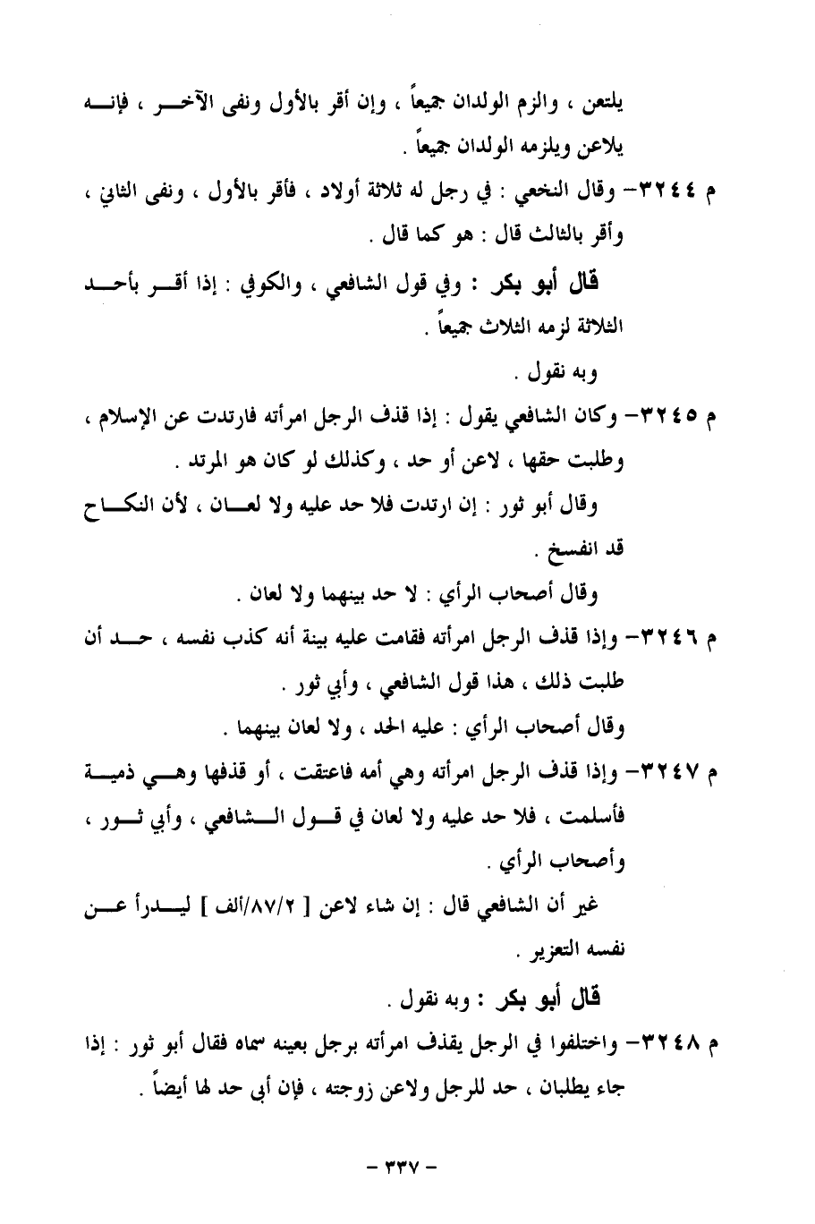 م 3248 - واختلفوا في الرجل يقذف امرأته برجل بعينه سماه فقال أبو ثور: إذا جاء يطالبان، حد للرجل ولاعن زوجته، فإن أبى حد لها أيضاً.
