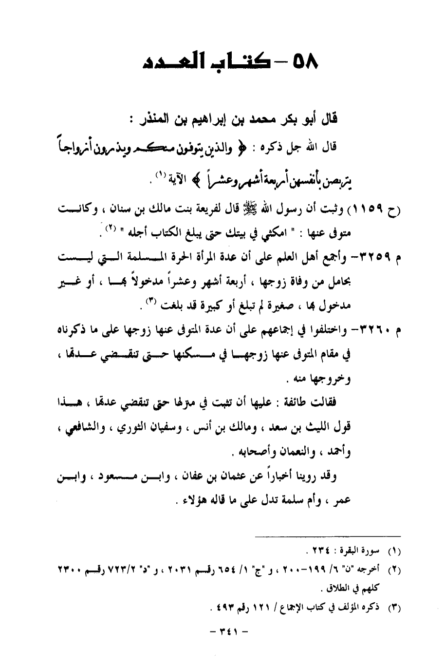 (ح 1159) وثبت أن رسول الله - صلى الله عليه وسلم - قال لفريعة بنت مالك بن سنان، وكانت متوفى عنها: "امكثي في بيتك حق يبلغ الكتاب أجله".