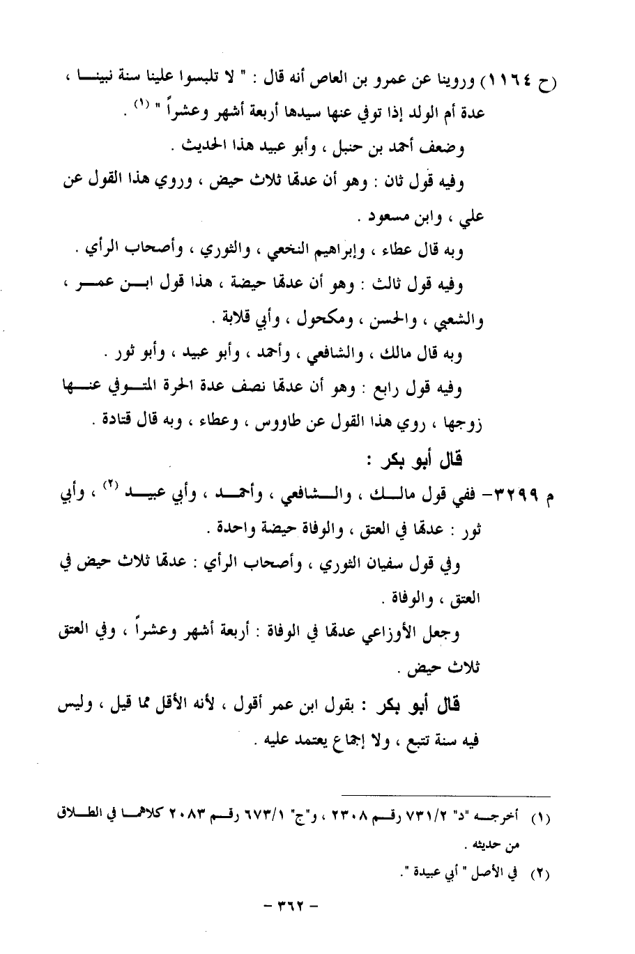 (ح 1164) وروينا عن عمرو بن العاص أنه قال: "لا تلبسوا علينا سنة نبينا، عدة أم الولد إذا توفي عنها سيدها أربعة أشهر وعشراً".