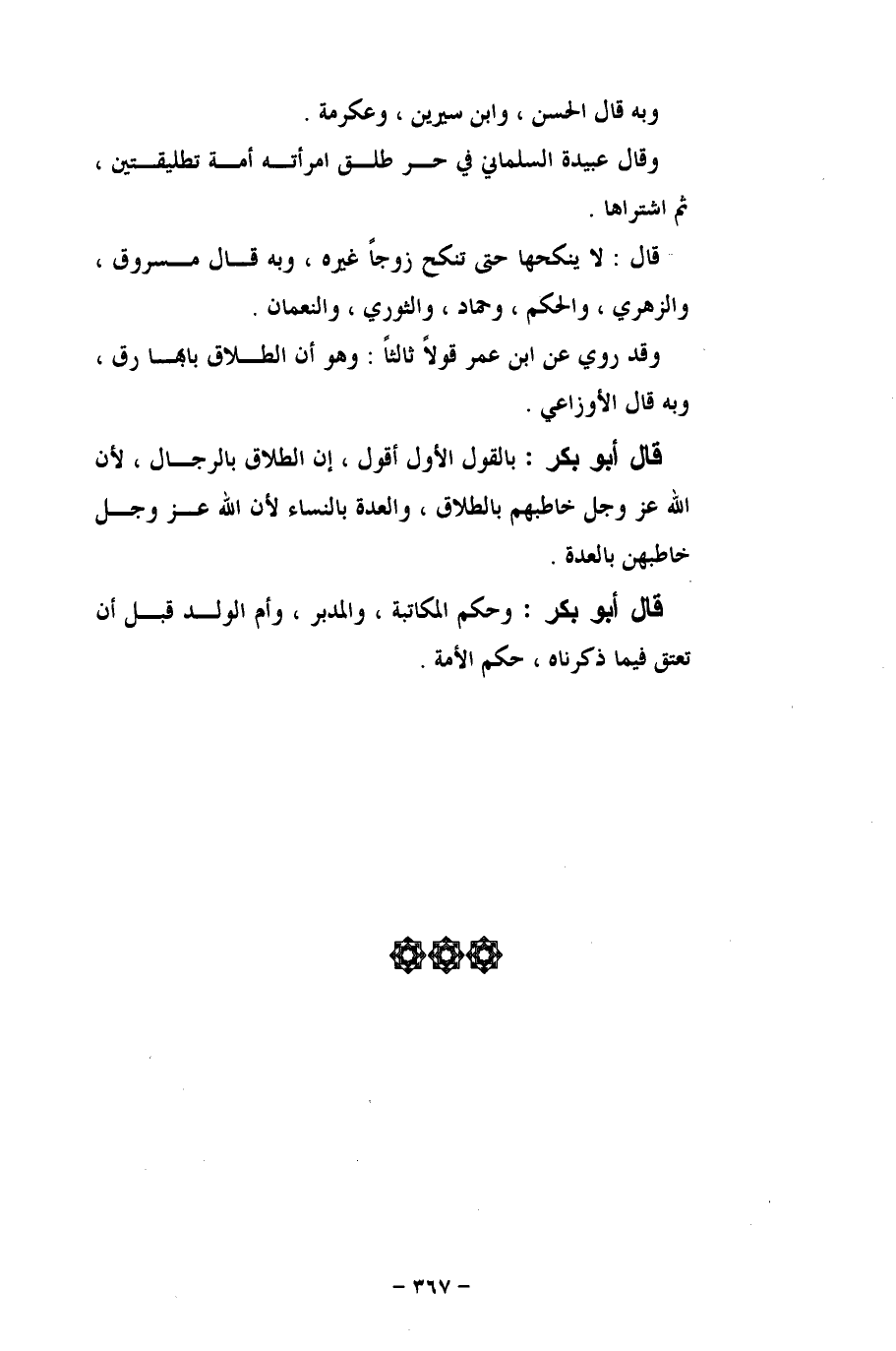 قال أبو بكر: بالقول الأول أقول، إن الطلاق بالرجال، لأن الله عَزَّ وَجَلَّ خاطبهم بالطلاق، والعدة بالنساء لأن الله عز وجل خاطبهن بالعدة.
