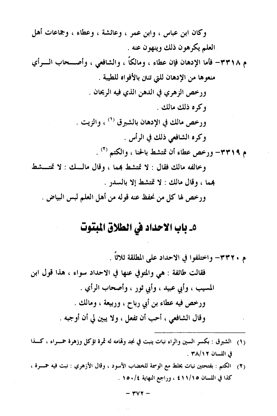م 3318 - فأما الإدهان فإن عطاء، ومالكاً، والشافعي، وأصحاب الرأي منعوها من الإدهان للتي تنتن بالأفواه للطيبة.
