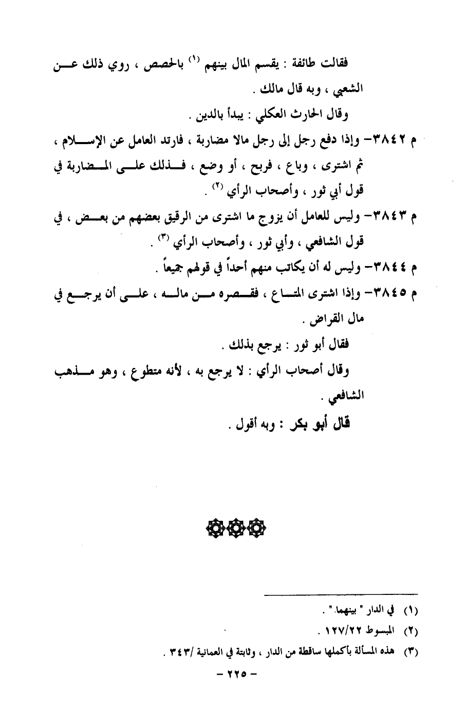م 3842 - وإذا دفع رجل إلى رجل مالاً مضاربة، فارتد العامل عن الإسلام، ثم اشترى، وباع، فربح، أو وضع، فذلك على المضاربة في قول أبي ثور، وأصحاب الرأي.