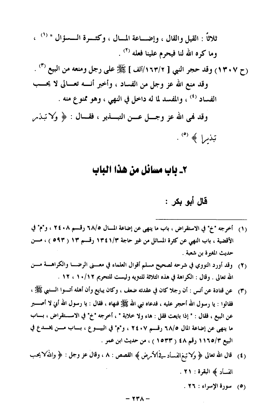 وقد منع الله عَزَّ وَجَلَّ من الفساد، وأخبر أنه تعالى لا يحب الفساد، والمفسد لما له داخل في النهي، وهو ممنوع منه.