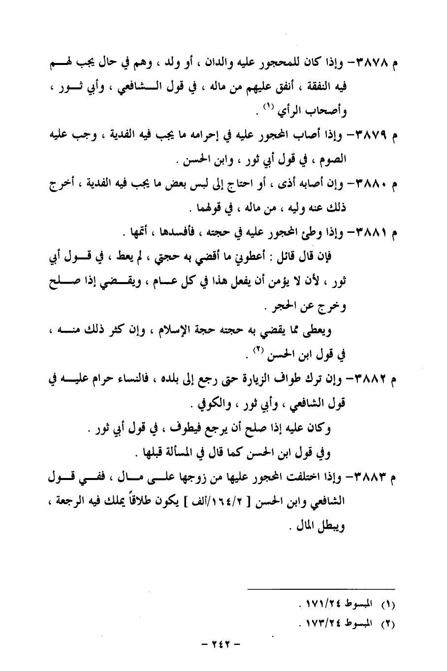 م 3878 - وإذا كان للمحجور عليه والدان، أو ولد، وهم في حال يجب لهم فيه النفقة، أنفق عليهم من ماله، في قول الشافعي، وأبي ثور، وأصحاب الرأي.