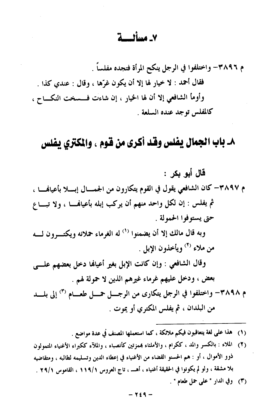 م 3897 - كان الشافعي يقول في القوم يتكارون من الجمال إبلا بأعيانها، ثم يفلس: إن لكل واحد منهم أن يركب إبله بأعيانها، ولا تباع حتى يستوفوا الحمولة.