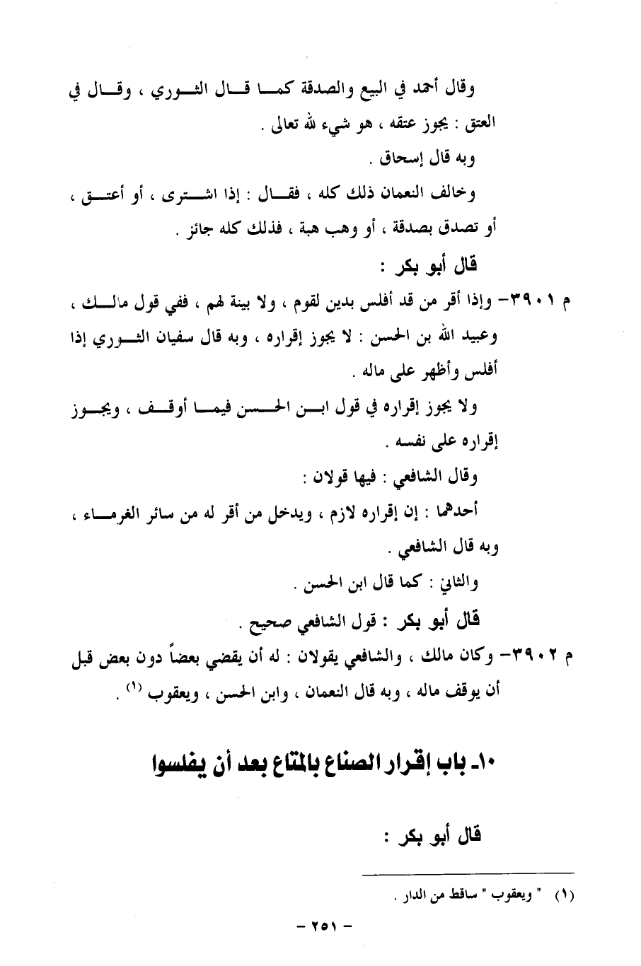 م 3901 - وإذا أقر من قد أفلس بدين لقوم، وبينة لهم، ففي قول مالك، وعبيد الله بن الحسن: لا يجوز إقراره، وبه قال سفيان الثوري إذا أفلس وأظهر على ماله.
