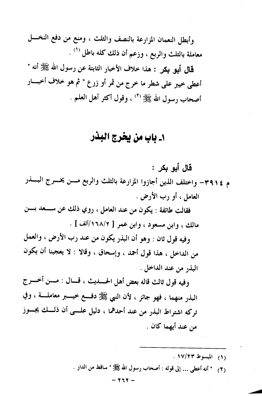 م 3914 - واختلف الذين أجازوا المزارعة بالثلث والربع من يخرج البذر العامل، أو رب الأرض.
