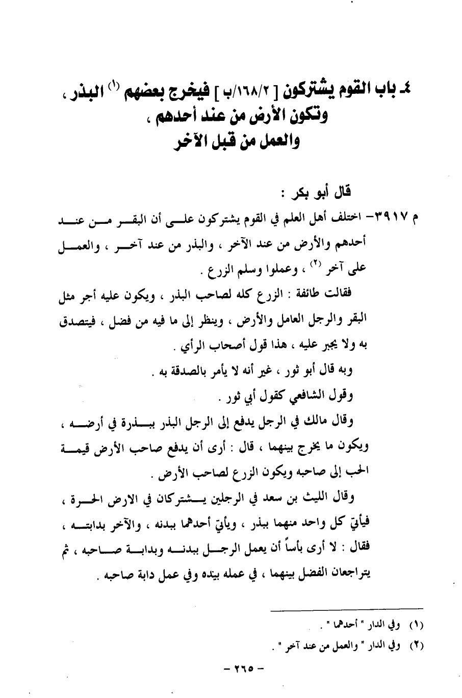 م 3917 - اختلف أهل العلم في القوم يشتركون على أن البقر من عند أحدهم والأرض من عند الآخر، والبذر من عند آخر، والعمل على آخر (¬2)، وعملوا وسلم الزرع.
