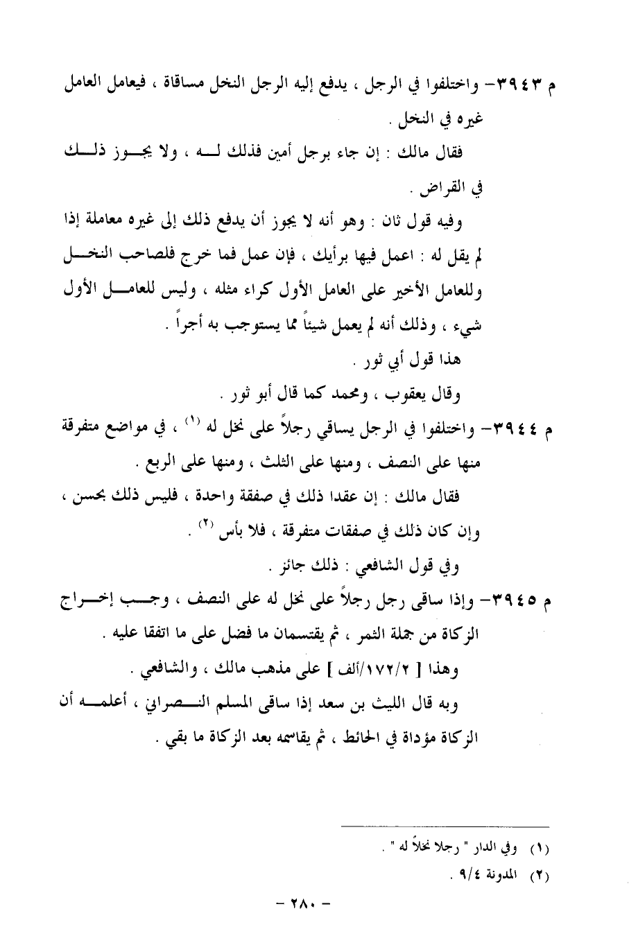 م 3944 - واختلفوا في الرجل يساقي رجلاً على نخل له (¬1)، في مواضع متفرقة منها على النصف، ومنها على الثلث، ومنها على الربع.