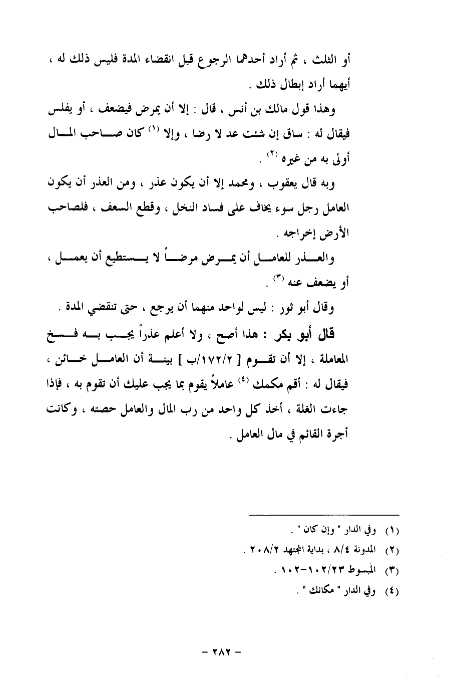 قال أبو بكر: هذا أصح، ولا أعلم عذراً يجب به فسخ العاملة، إلا أن تقوم [2/ 172/ب] بينة أن العامل خائن، فيقال له: أقم مكمك (¬2) عاملاً يقوم بما يجب عليك أن تقوم به، فإذا جاءت الغلة، أخذ كل واحد من رب المال والعامل حصته، وكانت أجرة القائم في مال العامل.