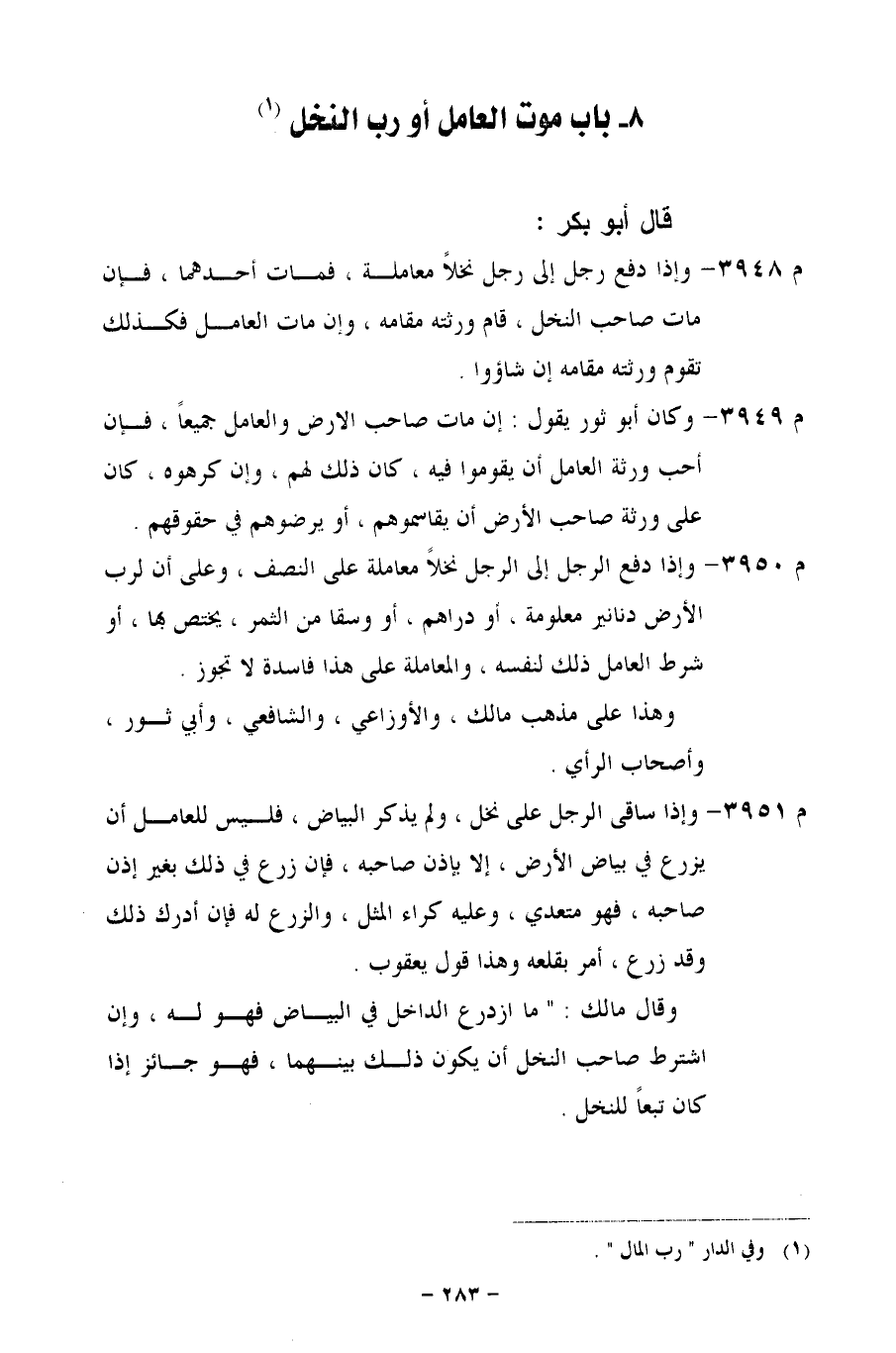 م 3949 - وكان أبو ثور يقول: إن مات صاحب الأرض والعامل جميعاً، فإن أحب ورثة العامل أن يقوموا فيه، كان ذلك لهم، وإن كرهوه، كان على ورثة صاحب الأرض أن يقاسموهم، أو يرضوهم في حقوقهم.