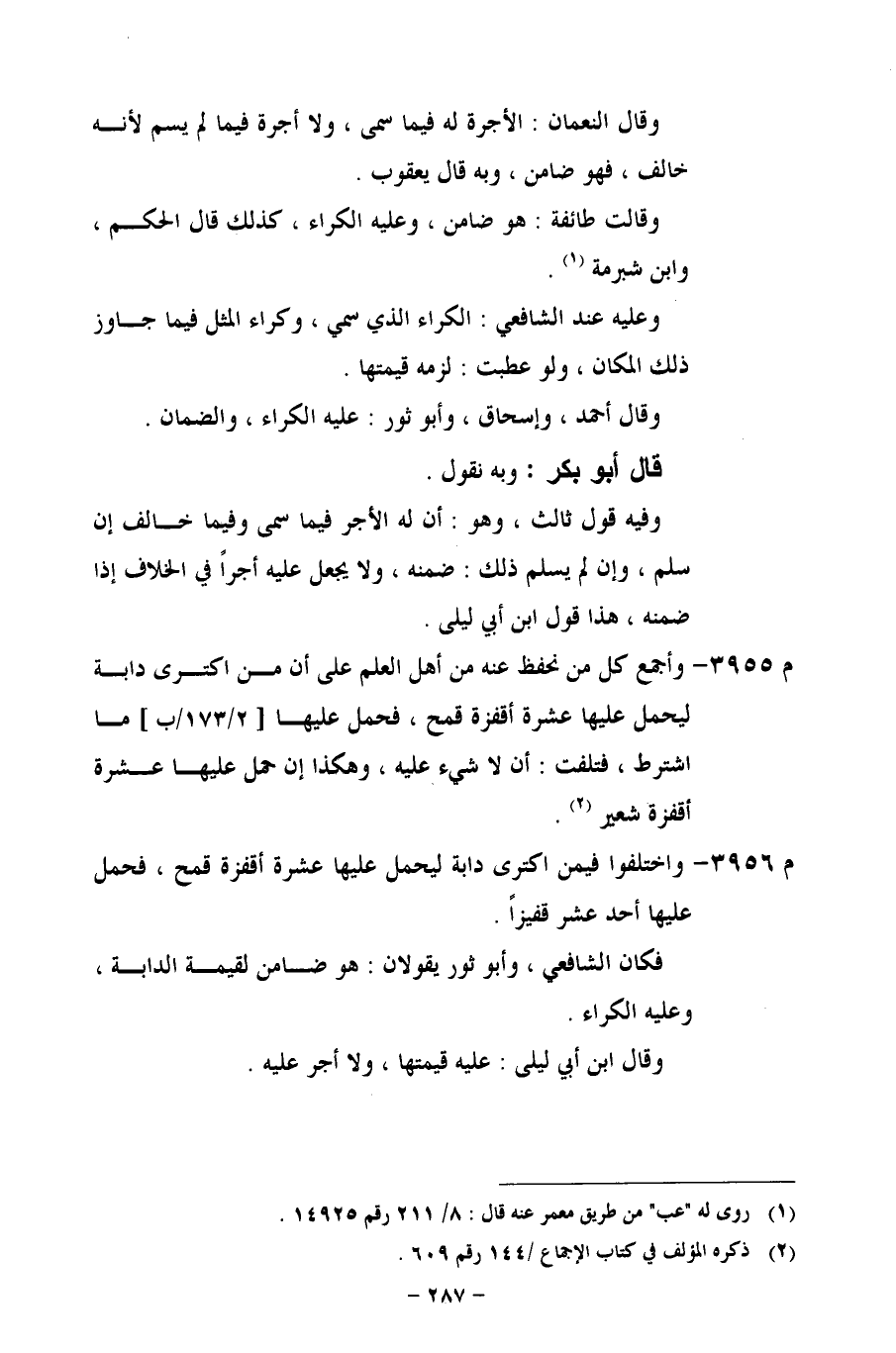 م 3955 - وأجمع كل من نحفظ عنه من أهل العلم على أن من اكترى دابة ليحمل عليها عشرة أقفزة قمح، فحمل عليها [2/ 173/ب] ما اشترط، فتلفت: أن لا شيء عليه، وهكذا إن حمل عليها عشرة أقفزة شعير.