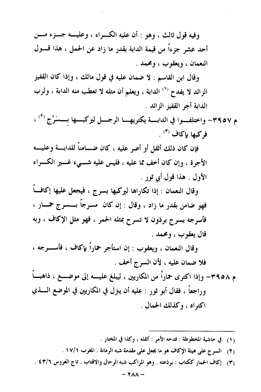 م 3958 - وإذا اكترى حماراً من المكاريين، ليبلغ عليه إلى موضع، ذاهباً وراجعاً، فقال أبو ثور: عليه أن ينزل في المكاريين في الموضع الذي اكتراه، وكذلك الحمال.