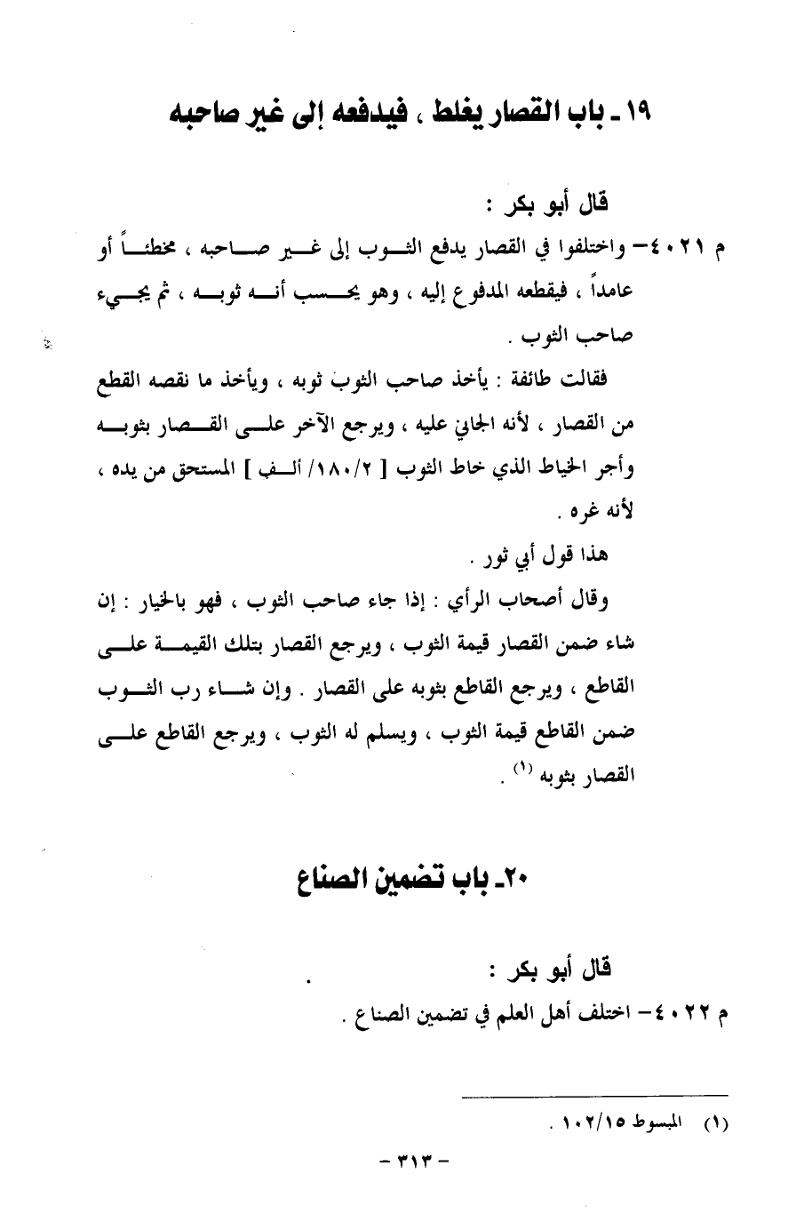 م 4021 - واختلفوا في القصار يدفع الثوب إلى غير صاحبه، مخطئاً أو عامداً، فيقطعه المدفوع إليه، وهو يحسب أنه ثوبه، ثم يجيء صاحب الثوب.
