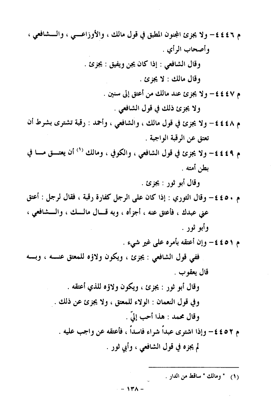 م 4446 - ولا يجزئ المجنون المطبق في قول مالك، والأوزاعي، والشافعي، وأصحاب الرأي.
