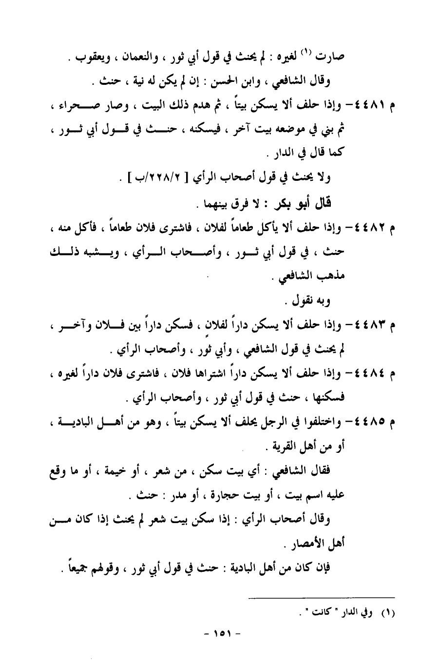 م 4483 - وإذا حلف ألا يسكن داراً لفلانٍ، فسكن داراً بين فلان وآخر، لم يحنث في قول الشافعي، وأبي ثور، وأصحاب الرأي.