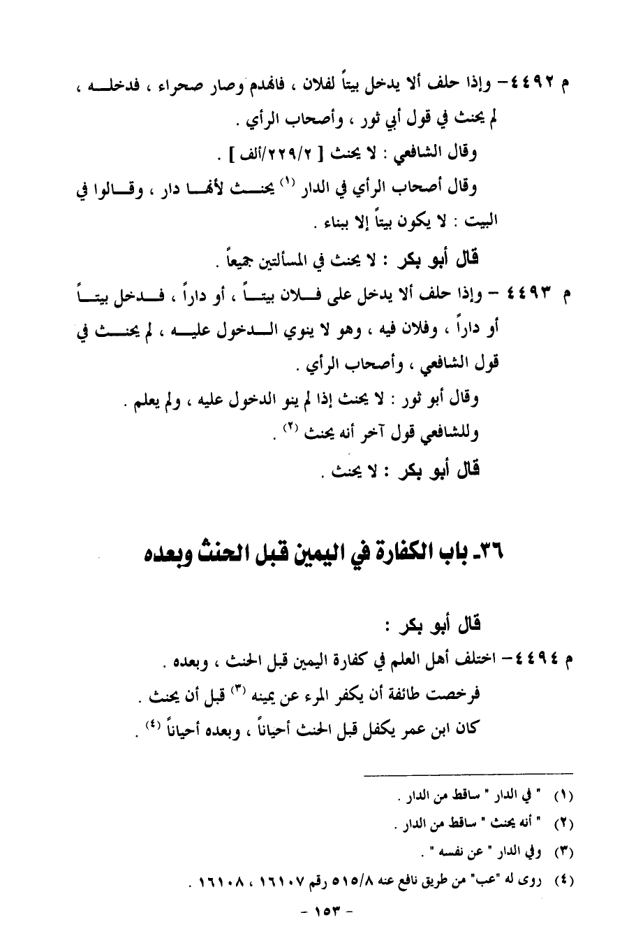 م 4492 - وإذا حلف ألا يدخل بيتاً لفلان، فانهدم وصار صحراء، فدخله، لم يحنث في قول أبي ثور، وأصحاب الرأي.